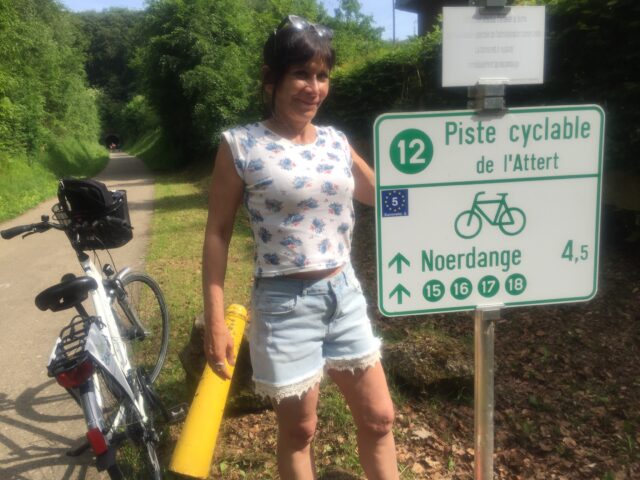 Notre première piste cyclable, c’est la PC 12 de l’Attert (les pistes portent un numéro pour se repérer sur les cartes dédiés aux cyclistes), du nom d’une rivière belgo-luxembourgeoise. Rien d’étonnant puisque le Luxembourg est « imbriqué » dans le puzzle France, Belgique, Allemagne. C’est le bonheur de découvrir le Gutland, une campagne et des villages paisibles, une magnifique forêt. Je suis pleine de gratitude pour mes hôtes qui nous ont concocté ce parcours enchanteur, avec le soleil en prime. Nous sommes seuls au monde, parfois nous saluons un cycliste. Rare ! Ici pas de risques d’embouteillages de vélos comme sur les côtes de l’ile de Ré. Ce type de cyclotourisme n’est pas à la portée de tous : il est celui de personnes initiées qui ont bien repéré les atouts du Luxembourg !